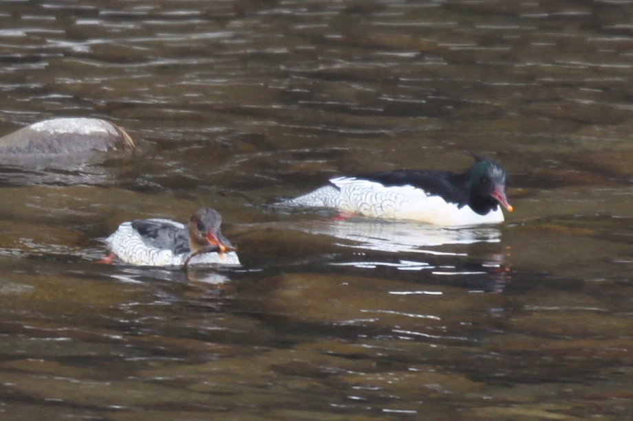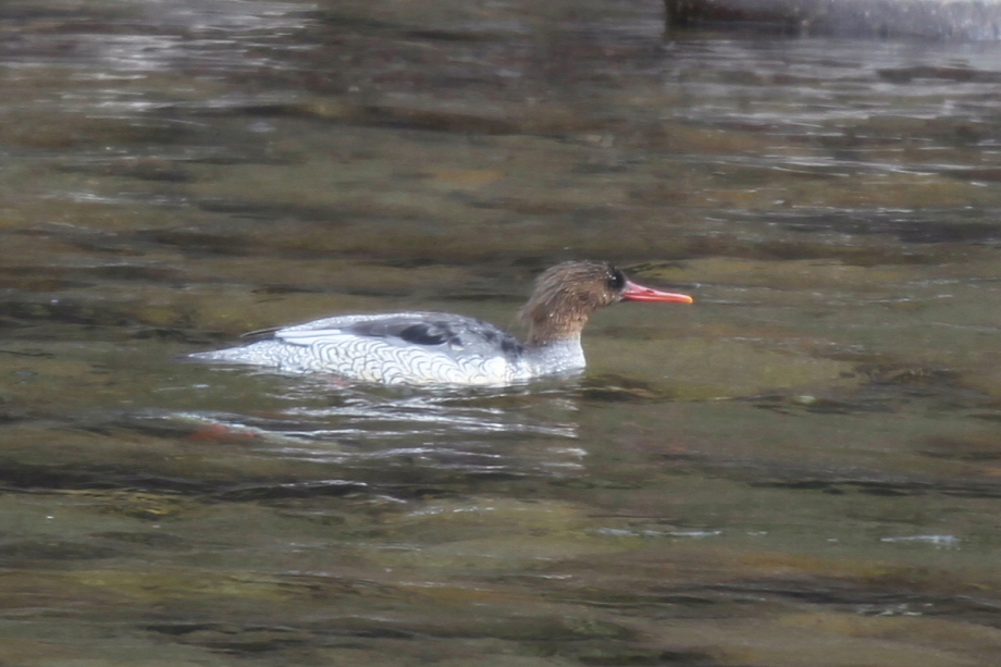 ポイントが近づいたので川の上流方向に右折しょうとすると下流方向に県外ナンバーの車が止まっていました。双眼鏡でその車を覗くと窓から望遠レンズが出ているのが見えました。レンズの前方を見ると憧れのコウライアイサがいました。慌てて取り敢えず連写。