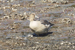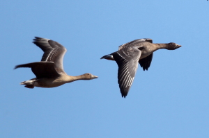 ところが想像もしない事が往々にして起こるものでして、一番奥の山影から作業服を着た人が干上がった池底を歩いて出て来ました。改めて奥の方を双眼鏡で覗くと、なんと測量の杭が何本も設置されています。でも、その時は池の中ほどには来ることは無いだろうと思い、食べ掛けの弁当に集中していると、なんとその作業員はこちらに向かって歩いて来ていました。やばい!と、慌ててカメラに手を掛けるとすでにオオヒシクイ達は飛び立ってしまいました。