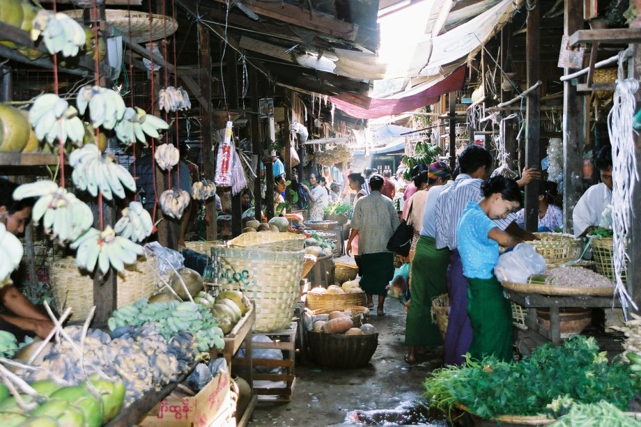 最初に訪れたのはニャンウーマーケットです。そもそも、バガンと云う町は、首都ヤンゴンから飛行機で1時間30分ぐらい北西に飛んだ所に有る11世紀から12世紀にかけて栄えた古都ですが、あの日本を襲ったクビライハーンの蒙古に滅亡させられたわけでして、仏教遺跡以外には何も有りそうに有りません。実際、その日訪れた所は、このマーケット以外は全てパゴダと寺院だけです。その移動中、バスの窓から見えるのは、ただただ赤茶けた起伏の少ない大地の上に、廃墟と化した無数のパゴダと寺院だけです。緑の木々は生えています。でも、森や林じゃないんです。日本では見たこと無い風景なので説明し難いんですが、あまり大きくない木が何処まで行っても点在しているんです。畑らしい所は見当たりません。