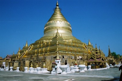 それはシュエジーゴンパゴダです。マイクロバスがその参門前に着くと、モーさんが皆に裸足になるようにと告げます。ガイドブックに因ってパゴダでは、なんびとも裸足にならないといけないと言うことは知っていました。でも未だパゴダの姿なんか見えないのにな〜?って思っていると、敷地内は全て裸足だと言う事です。そして入り口に下足置き場はないからバスの中で脱いで行くと言う事でした。それはいいんだけど、一歩バスのステップを降りて皆おお慌てです。土が煮えてるンです。朝の10時頃だったんですけど、もう土がフライパンで炒ったんじゃ無いかと思える様な状態でした。