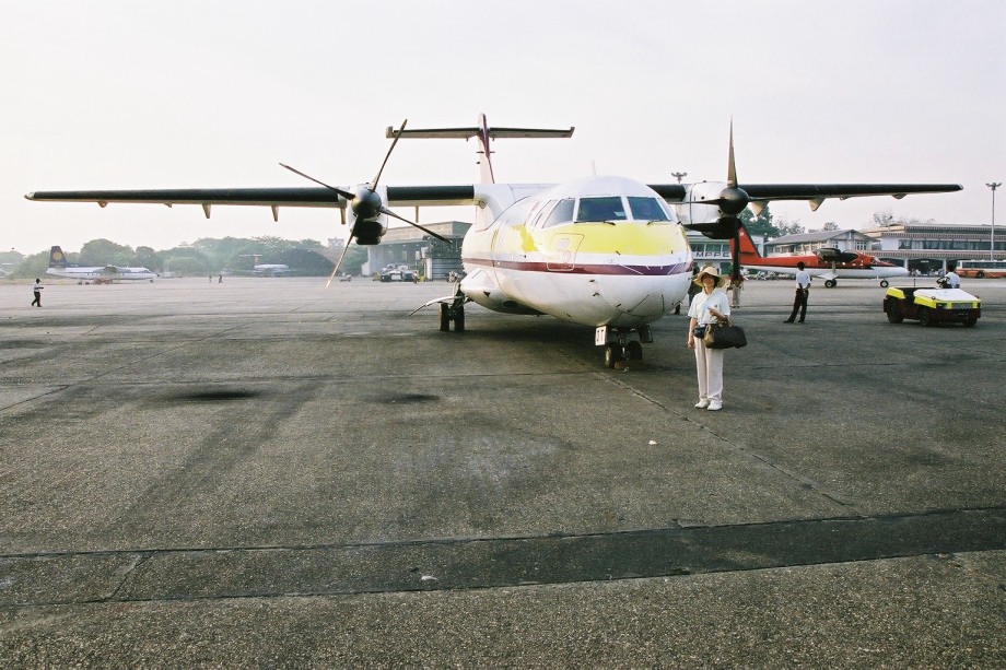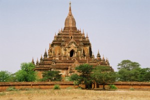 次の日は朝早くから起きてバガンへ出発です。泊ったホテルはそこそこりっぱなホテルで気持ちの良い朝を迎えられたのですが、8時頃バガン空港に着いてびっくりです。なんと気温が34度でした。朝の8時ですよ。日中は45度ぐらいになるんじゃないかと6人が不安がってると、モーさんが、その日の行程を教えてくれました。つまり、昼中は暑すぎて現地の人でも出歩かないそうです。だから我々もお昼ご飯を食べたら、さっさとエアコンの効いたホテルに帰って4時まで休憩と言うことでした。それを聞いて一安心した我々は、意気揚揚と強い日差しの中、観光に出かけて行きました。