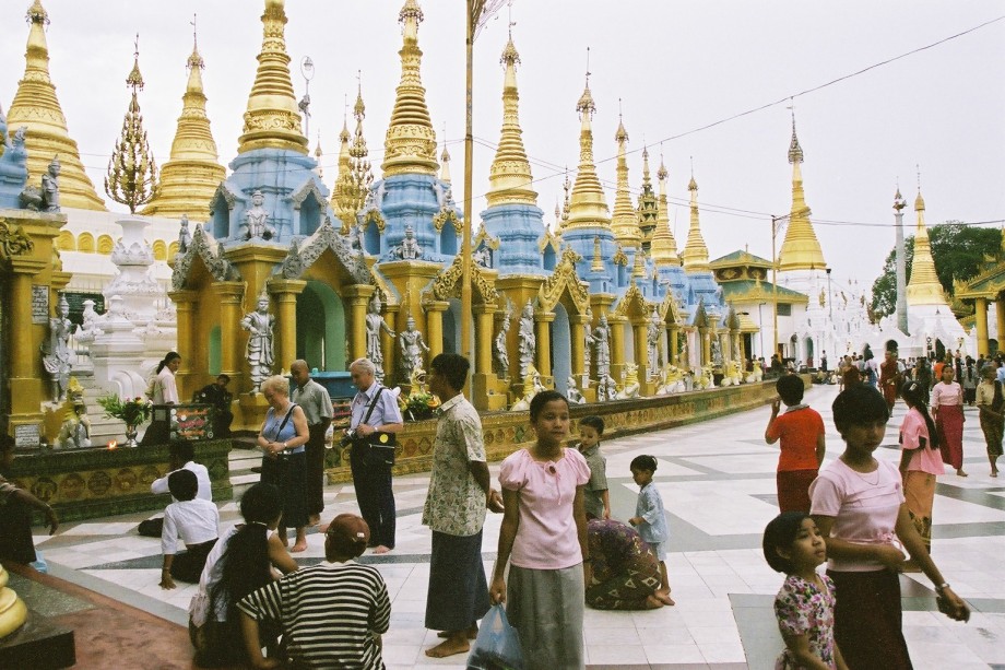 その四つの参道を通って、朝な夕なに街の人々がお参りに来るのでしょう。その日、私達が、そこを訪れたのは、夕げの支度に忙しい時間帯の4時から5時頃でした。でも境内には、あふれんばかりの街の人達で一杯でした。始め私は、この人の群れは、ミャンマー国内の観光客の人達なのかなって思ったのですが、よく見ると、買い物帰りや子供連れの近所の人達って感じでした。つまり特別な目的や行事の為ではなく、日常生活の延長上に、この場所が有るって感じなのです。見方を変えれば、仏教を通してしか日常生活が無いって思えるほどでした。