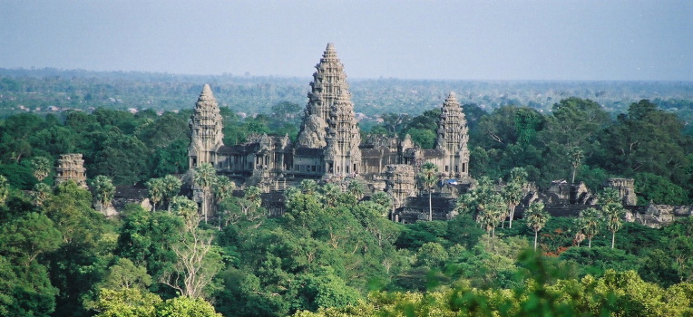 その言葉に乗せられて、その上、沢山の観光客が一様に頂上を目指しているのを見ると、何と無く、これはきっと良いことが有るに違いないと言う群集心理が働いて、皆黙々とドンさんの後を追いかけるのでした。結果から先に言うと、その日は不発でした。頂上で日が沈むまで約1時間待ちましたが、西だけ雲がかかっていて、アンコールワットは金色に輝くことは有りませんでした。でも、プノンバケンの頂上からアンコールワットを見ると、本当にジャングルに埋もれていた遺跡だと言うことが良く分かります。その平らな大地は樹海の濃い緑に覆い尽くされ、有るであろう道すら見えません。360度の視界は、全てジャングルです。そのジャングルの中に明日は私達も入って行きます。