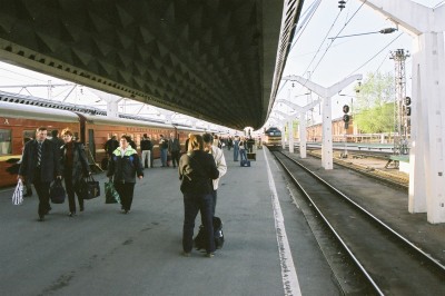この発想の違いが、最終日の自由時間に地下鉄に乗った私達をちょっとしたパニック状態に落し入れるの事になるのですが、その話しは又にして、取合えずサンクトペテルブルグ行きの「赤の矢号」に乗るために、私達は、夜の11時ごろレニングラード駅に到着しました。そこはモスクワとロシア第2の都市を結ぶ駅とはとても思えないほど、うら寂しくて、薄暗いところでした。私達のバスの駐車場が裏口だったのかも知れませんが、線路沿いにバスは止まり、コンコースらしきものは無くて、いきなり、本当に薄暗いプラットホームに上がった時は、なんだか、昔のソ連時代のスパイ映画の1シーンの中にいるようで、逆に興奮させられるものが有りました。