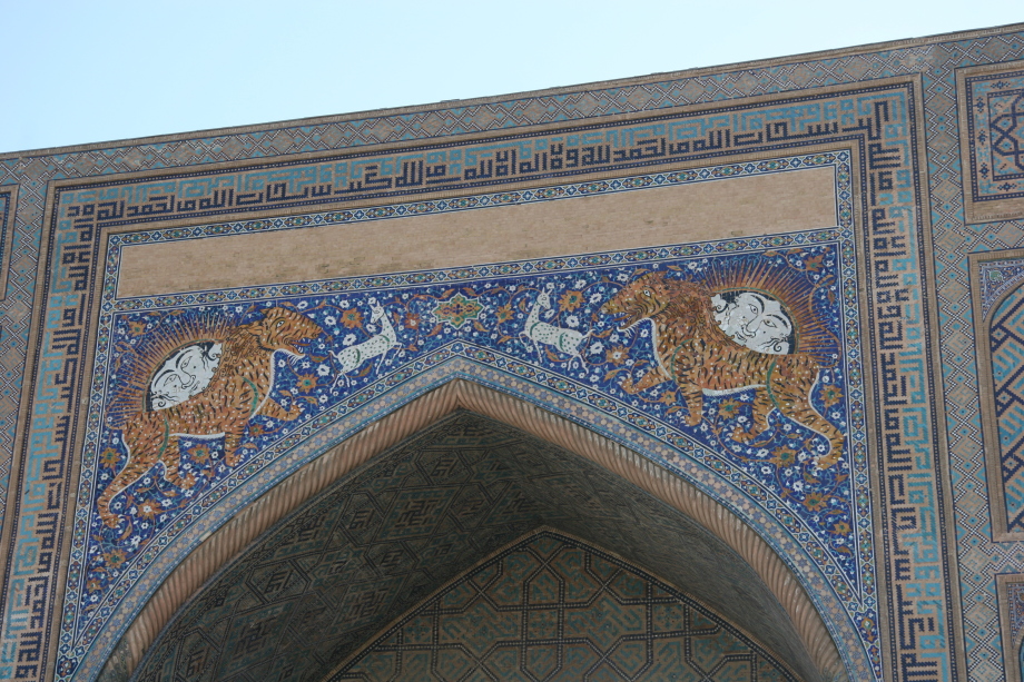 入口アーチには小鹿を追うライオン(どう見てもトラにしか見えない)が人面を帯びた日輪を背に描かれています。本来イスラムの文様は、人や動物の姿をモチーフにすることはタブーとされています。あえて禁が破られ、この様なデザインが描かれたのは、支配者が自分の権力を誇示しようとしたためらしいということです。しかし、その代償に建築家が責任を取って自殺したという伝説も残っているようです。 |